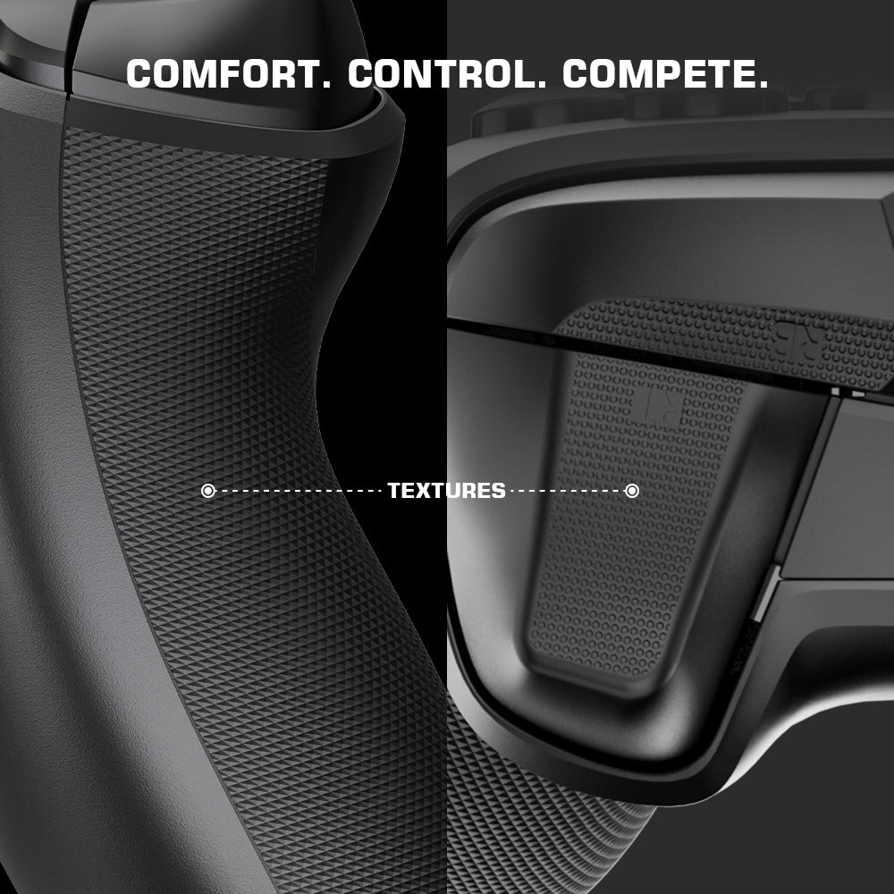 As texturas em cada pára-choques e gatilhos mantêm seus dedos firmes no controle durante ações rápidas, enquanto as alças de borracha texturizada na parte traseira proporcionam conforto o dia todo.
